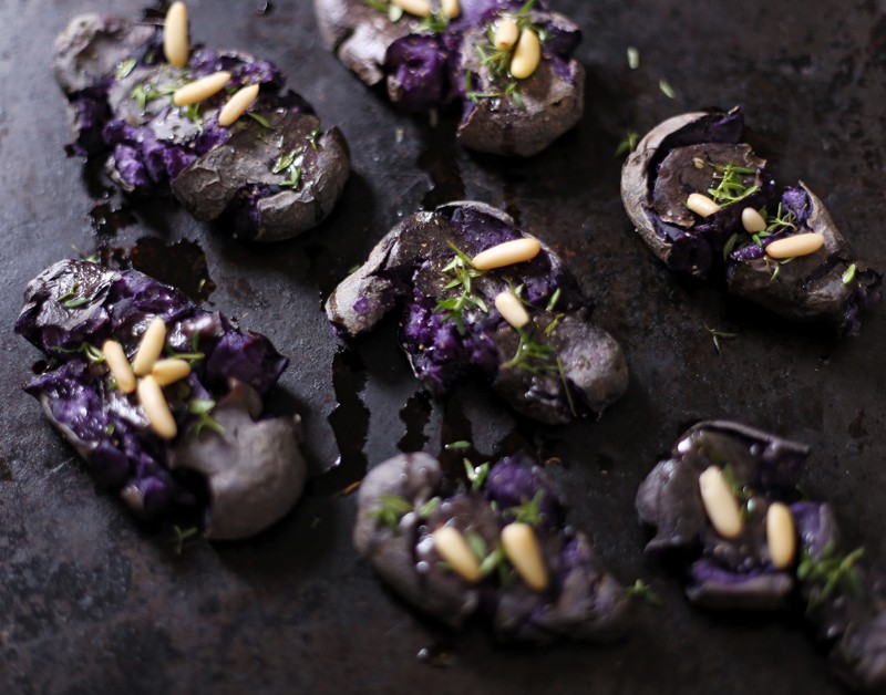 Smashed Purple Potatoes: boil the potatoes until fork tender. Then, add cream, butter and salt and mash until desired consistency has been achieved. Stir in maple syrup, cinnamon and cardamom.